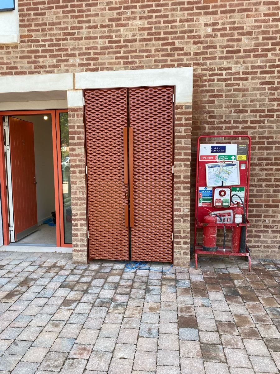 Caption: Expanded metal meter cupboard doors at Duncombe Barracks, powder-coated to match the development’s colour palette.